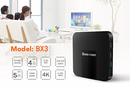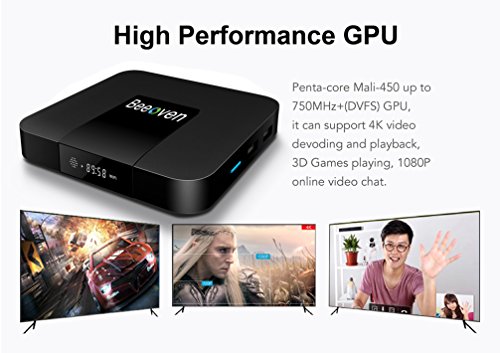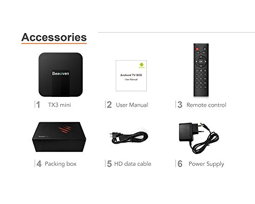 Studio : Beeoven Publisher : Beeoven Binding : Electronics Product Description Main Hardware Specifications Operating system version: Android 7.1 Nougat CPU: Amlogic S905W up to 2.0 GHz, Quad core ARM Cortex-A53 GPU: Mali-450 penta-core, up to 750MHz (DVFS) RAM: 1G DDR3 ROM: 8G EMMC Power Supply Specifications Power Supply: DC 5V/2A Power Indicator (LED): Power On: Blue; Standby: Red Other Hardware HDMI: HDMI 2.0(CEC and HDCP 2.2 ),4K X 2K @60 fps Wireless: Built-in WIFI, Support IEEE802.11 b/g/n LAN:Ethernet 100M standard RJ-45(IEEE 802.3 Gigabit) USB Host: 2 High speed USB 2.0,support U DISK and USB HDD Card Reader: TF Card reader AV In: AV(3 in 1) port SPDIF: Coaxial(Optical) Software Specifications Decoder Formats: 4K,H.265,MPEG1/2/4,H.264, HD AVC/VC-1,RM/RMVB,Xvid/DivX3/4/5/6 ,RealVideo8/9/10 Video Formats: 4K@30fps, H.265, AVI, H.264, VC-1, MPEG-2, MPEG-4, DIVD/DIVX, Real8/9/10, RM,RMVB, PMP, FLV, MP4, M4V, VOB, WMV, 3GP, MKV Music format: MP1, MP2, MP3, WMA, OGG, AAC, M4A, FLAC, APE, AMR, RA, WAV Photo format: JPEG/BMP/GIF/PNG/TIFF DLNA: DLNA files sharing Languages: English/French/German/Spanish/Italian etc. 24 languages Network Functions: Skype chatting,YouTube,Netflix,Facebook,Airplay,Flicker,Online movies,etc. Other Feature: Free Internet searching,thousands of android applications,many kinds of games,etc. Package Includes 1 x Smart TV box? 1 x IR Remote control 1 x HDMI 2.0 cable? 1 x Power adapter 0