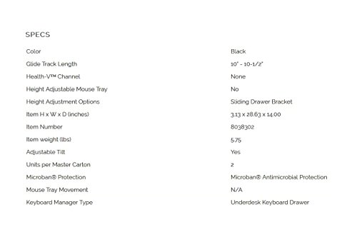 -. Feature : Attaches to virtually any work surface without tools or complex instructions, kindly refer the video for installation help and the user manual given below for troubleshooting steps. / Patented clamp attaches unit to desktop (5/8" - 1-1/2" thick) without surface damage (33-3/4" wide space required) / Tray adjustment tilts to 3, 6, or 9 degrees to suit personal preference, and separate tray and mouse platforms allow you to switch mouse position to right or left side of keyboard tray / Sturdy, impact-resistant tray fits standard and ergonomic keyboards, and the ball-bearing glide tracks ensure smooth drawer movement / Includes soothing memory foam wrist rest for keyboard tray and provides convenient cable management for keyboard and mouse cord, Can adjusts tray to one of three height positions below desktop for personal comfort: 2-1/2," 3-1/8,"and 3-3/4".