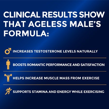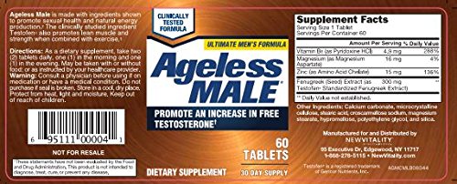 Studio : New Vitality Publisher : New Vitality Binding : Health and Beauty Product Description New Vitality Ageless Male Testosterone Booster Supplement Tablets boost free testosterone levels and a healthy romantic life plus incredible results in the gym. This testosterone supplement contains an ingredient derived from the Fenugreek herb called Testofen - shown in a human clinical study to significantly help boost free testosterone (the most important form of testosterone which is available for immediate use by the body) in men. If you are a male, 30 years or older, you may be experiencing fatigue, weakness, depression, and an overall drop in your sex drive. Furthermore, Ageless Male Testosterone Supplements support healthy energy metabolism and a healthy libido. In addition, these are testosterone boosters for muscle growth as a part of strength training, so you can easily rediscover the man you want to be. This supplement contains Vitamin B6, magnesium, zinc, fenugreek seed extract. Created by the original researchers at MIT, New Vitality Ageless Male Testosterone Pills has been shown to influence free testosterone levels in men, leading to a lean strong body with exercise to support a healthy sex life. *For a dual-action boost in sex more stamina, combine this Ageless Male Testosterone Support with Ageless Male Performance! 0