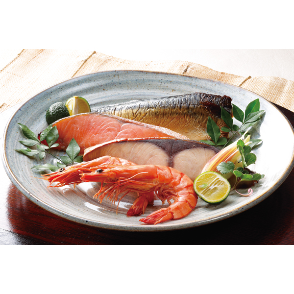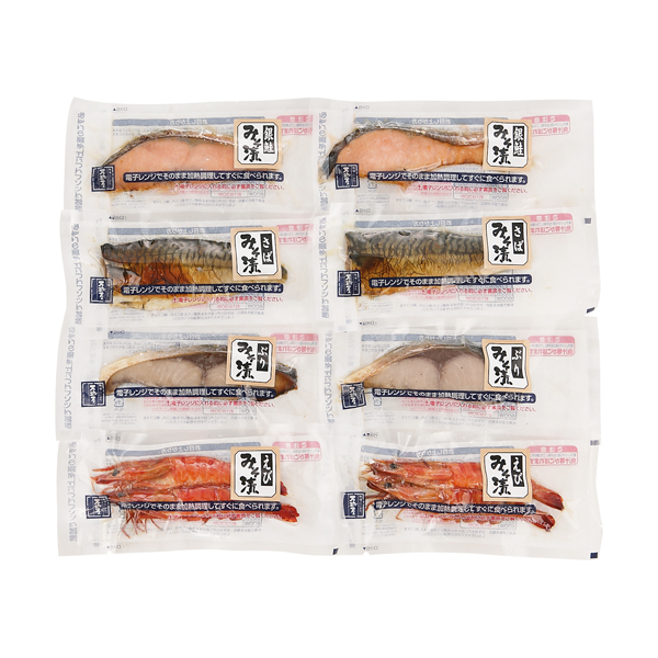 ●焼銀鮭味噌漬1切入・焼さば味噌漬1切入・焼海老味噌漬2尾入・焼ぶり味噌漬1切入×各2