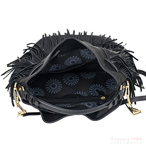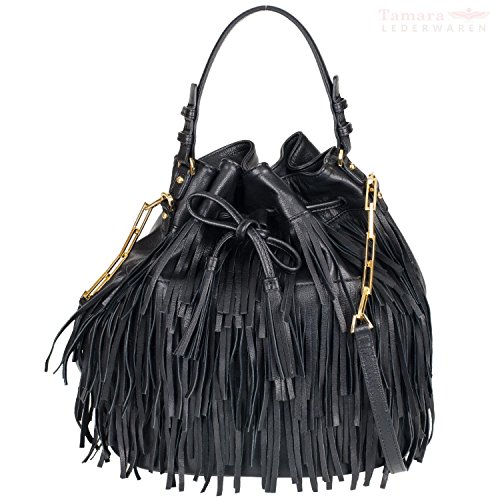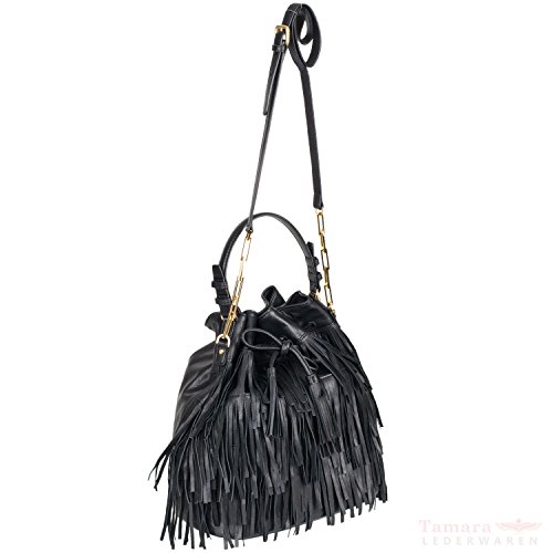 -. Brand : Abro -. Color : Schwarz -. Feature : Weiches Lammleder / Goldene Accessoires / Zugband-Verschluss mit Tassel / Ein Zipfach und ein zwei Steckfächer innen -. ProductGroup : Apparel -. ProductTypeName : APPAREL -. Title : Abro Damen Bucket Bag Mit Fransen Schwarz