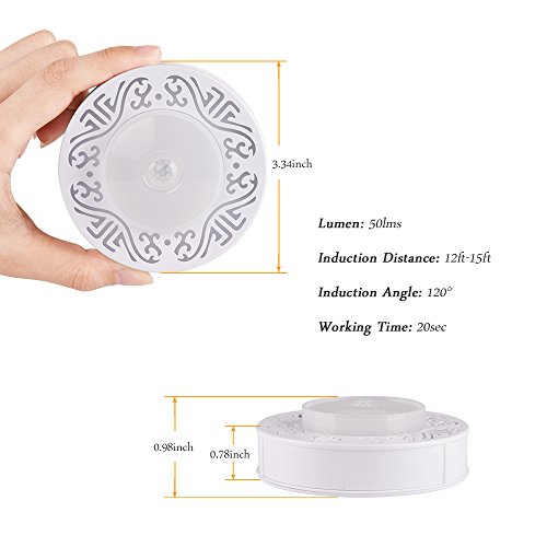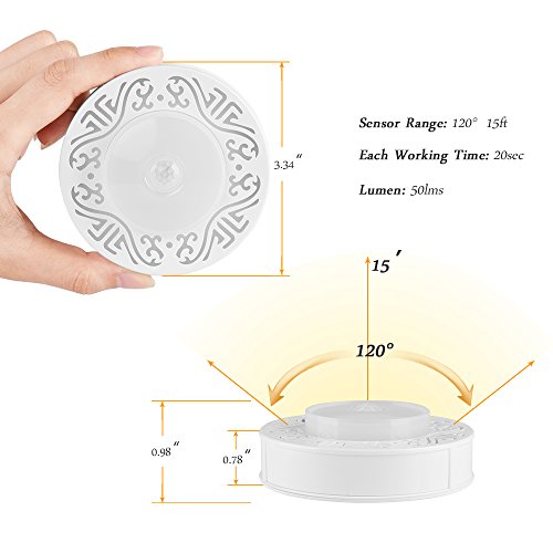 Specifications: ● Battery: 3pcs AAA batteries (excluded) ● 4.5v, 0.7w ● Sensitivity: 12-15 feet Distance ● Sensor Range: 120 degrees ● Operating temp: -20°C-40°C ● LED Qty: 6 LED ● Light color: Amber color ● LED life: 100,000 hours or more ● Color temperature: 2500K-2800K ● Mounting: 3M Tape