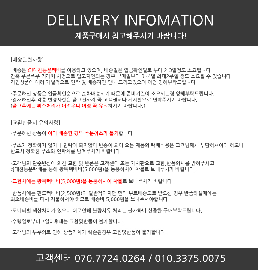 특이 사항 배송, 변경, 반품 환불에 대한 문의는 위 연락처로 문의 주세요.