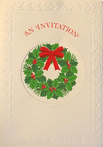 - Features an elegant white embossed holly border with a green and red holiday wreath and "An Invitation" printed in red font