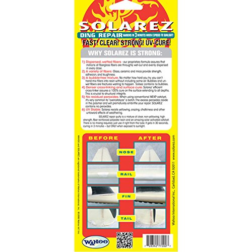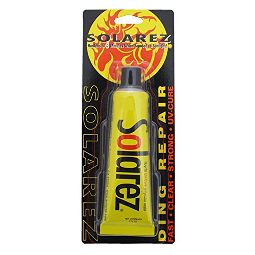 -. Feature : SOLAREZ repair putty is a mixture of clear, non-yellowing, high strength, fiber reinforced polyester resin and an amazing solar activated catalyst. There is no mixing required, just use it right from the tube. It gels in 30 seconds, curing in 3 minutes - but ONLY when exposed to sunlight. Solarez clear polyester resin 2oz tube. / ProP.R.Ietary formula assures that millions of fiberglass fibers are throughly wet-out and evenly dispersed in every dose. / Bubble-free mixture. / Denser cross-linking and surface cure. / No residual peroxides.