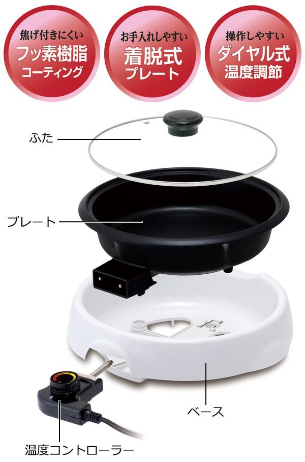 1台で煮る、焼く、蒸す、炒めることができる万能鍋です!!焦げ付きにくいフッ素樹脂コーティングの施されたプレートは、着脱式でお手入れも楽々♪