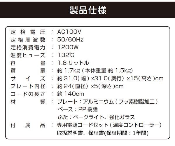 fk094igrjs1台で煮る、焼く、蒸す、炒めることができる万能鍋です焦げ付きにくいフッ素樹脂コーティングの施されたプレートは、着脱式でお手入れも楽々♪ サイズ 個装サイズ:32×12×31cm 重量 個装重量:2100g 製造国 中国 1台4役の万能鍋 1台で煮る、焼く、蒸す、炒めることができる万能鍋です焦げ付きにくいフッ素樹脂コーティングの施されたプレートは、着脱式でお手入れも楽々♪