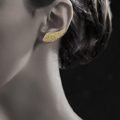 These angel wing cuff earrings' heavenly presence features an elegant design and undeniable sparkles. Made of yellow gold flashed fine 925 sterling silver. Set with 1.08 carat round cut clear cubic zirconia in pave and micro pave setting. Earrings measure 1.35 inch in length, 0.5 inch in width. Ear wire. Imported.