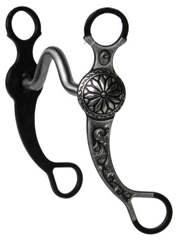 Product Description Floral vine medium port bit. Black satin finish. 5 1/8" sweet iron curved mouth with medium port and copper inlays. 7" cheek with Ss cut out trim and concho. Level 2 bit for moderate effect 0