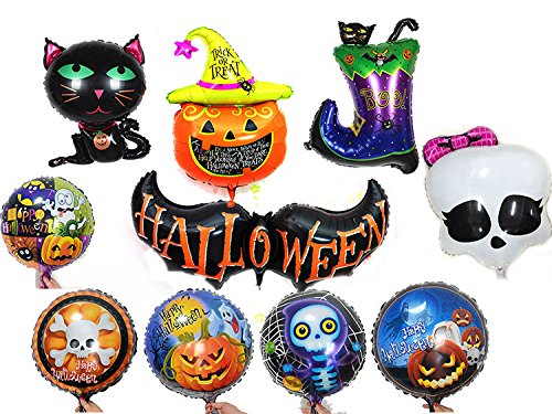 -. Feature : Product material:Aluminum foil / Product size:Cirle shape:18" 45X45cm Hand rod:50X30CM / Big pumpkin:105X65cm Cat:50X40cm Witch:50x45cm / Big bat:125X50cm Boot:65X45cm mickey:62cmX54cm / Pack of 14PCS