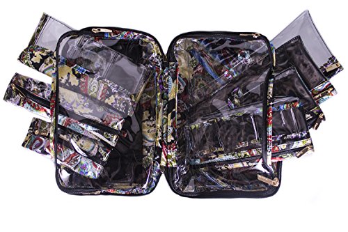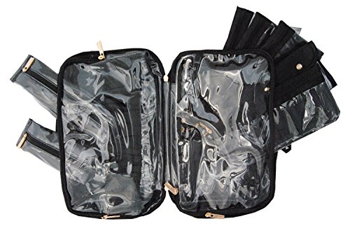 -. Feature : Size: 11" L x 5" W x 7" H. / 2 large inside compartments. 3 large removable pouches. / 2 removable multi-pocket pouches. Removable toothbrush case. / Removable razor case. Outside hidden hanging hook. / Expandable size to accommodate larger items.