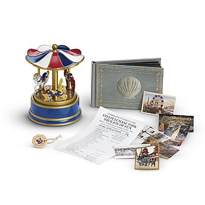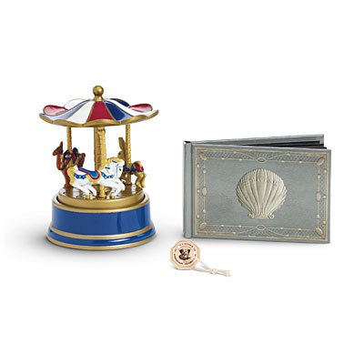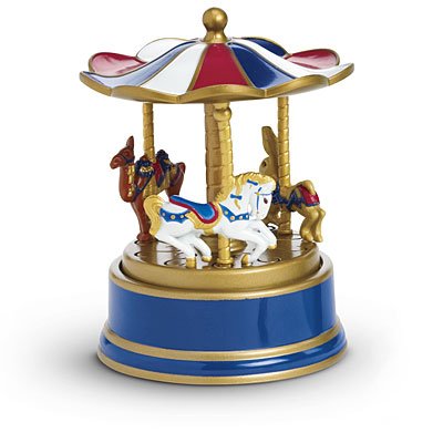 - A wind-up carousel music box with a sculpted and painted rabbit, camel, and horse, that turns while it plays the tune "Over the Waves"