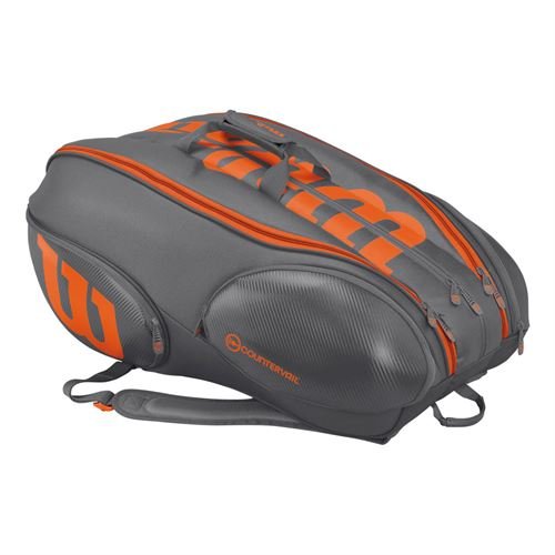Studio : Wilson Publisher : Wilson Binding : Misc. Product Description Wilson serves up a new "reverse" cosmetic look to the Wilson Burn 15 Pack Tennis Bag. Now instead of orange as the predominant color, Wilson has shifted towards grey as the primary color for the 15 pack racquet bag. The bag's efficient design can contain up to 15 uncovered racquets, plus players will enjoy easy-access pockets to store all of your essentials! Wilson created this Burn 15 pack tennis as one of the most long-lasting bags on the market today. The outer shell on the side of the bag helps ensure the ultimate protection for valuables inside the bag. Three central compartments, one which highlights Thermoguard 2.0 technology. Thermoguard 2.0 technology keeps strings and racquets safe against harmful weather conditions. The Burn 15 pack bag also includes a padded backpack carrying system with handy grab handles, helping to secure a comfortable carry on off the court. Overall, the Wilson Burn 15 Pack Tennis Bag is an outstanding choice for the competitive tournament player. 0