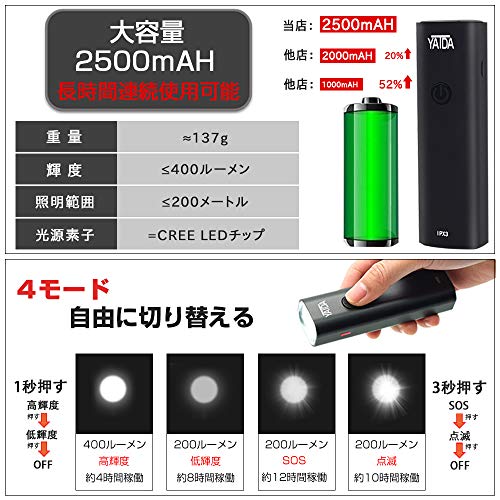 ◆ 製品に関して、各数値【ルーメン、防水性、充電時間、照明範囲】は計測方法により少し異なる可能性があります。