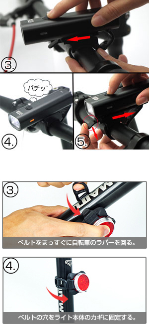 ◆ 3.ライトはバンドの取付部分の前方に沿ってスライドさせてマウントください。