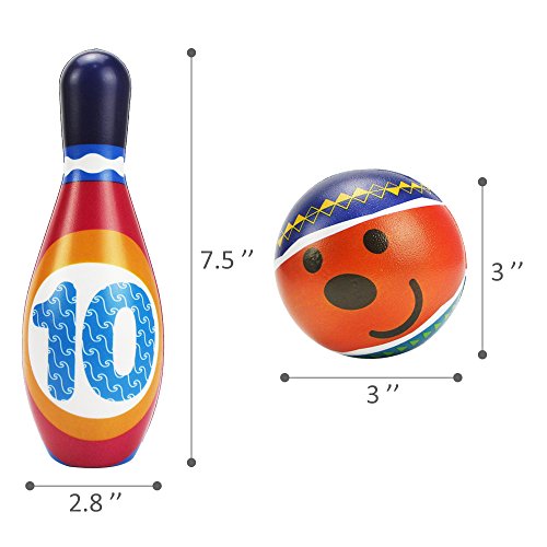 10 bowling pins(7") and 2 bowling ball(3"). Lightweight bowling ball toys, comes with ten foam pins and two foam bowling balls. It is easy for little hands to play.