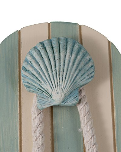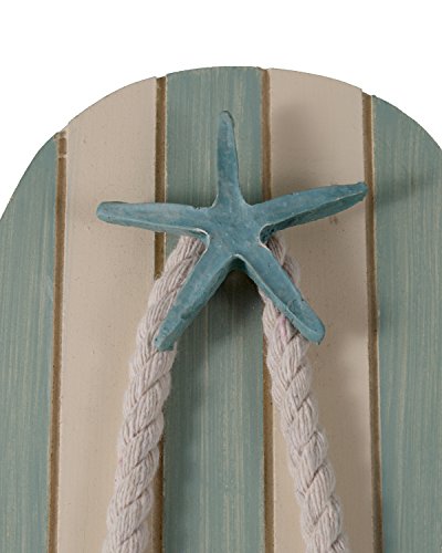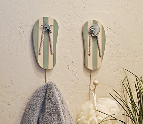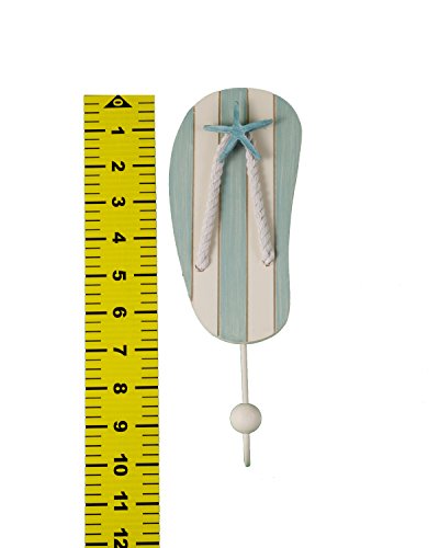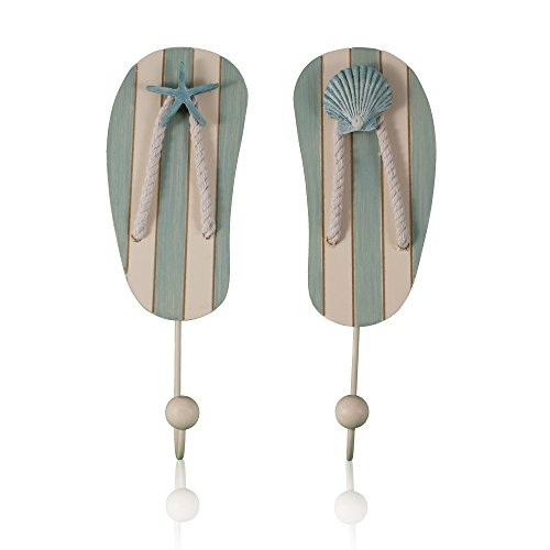 TROPICAL FLIP FLOP WALL HOOKS- SET OF 2 - 10 INCHES TALL WITH SEASHELL ACCENTS This set of 2 tropical, flip flop, beach themed wall hook organizers are both practical and decorative, featuring a pair of fun light blue/green and off white flip flops each with a hook. The fanciful design features real, twisted rope enhancing any tropical beach decor. Each hook is generously sized at 10 inches tall x 3.5 inches wide. The list of uses is limitless.Towel hook, robe hook, coat hook, key hook, dog leash hook BRING THE SEASIDE TO YOUR HOME Everyone loves the beach, the seaside, nautical decor and all things tropical. Your guests will be jealous of your clever design ideas and creative uses for these Flip Flop Hooks. Love shabby chic? The Tropical Flip Flop Hooks look amazing in a shabby chic home. Every time you look at these adorable wall hook organizers you will be reminded of your favorite day at the shore or the beach! TIRED OF LOOKING FOR YOU HAT OR SCARF OR KEYS??? Organize your life in every room with the Flip Flop Wall Hook Organizers. Pick a room and these wall hook organizers will make it better. Who knew storage could be so stylish? NEED THE PERFECT GIFT? Everyone wants to receive a great gift and of course every great gift should be useful - it is an amazing gift if it is visible every day as a reminder that you care enough to give only the best gifts!