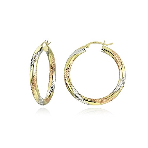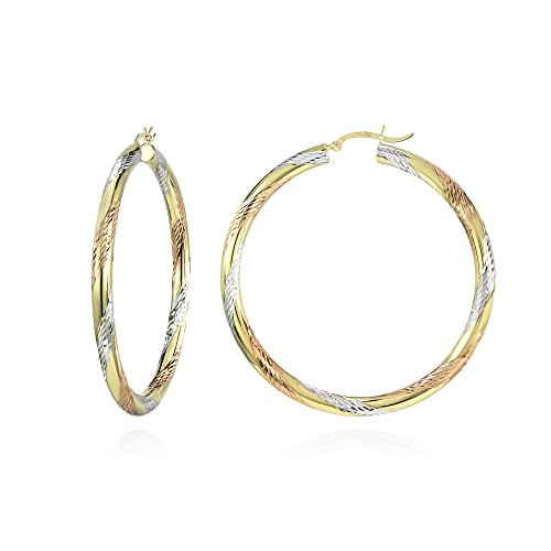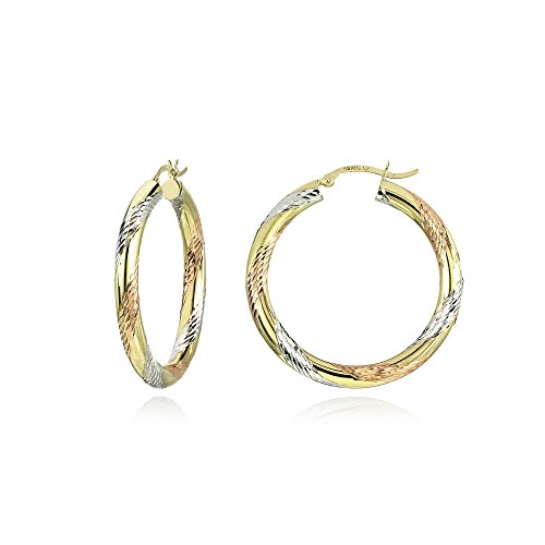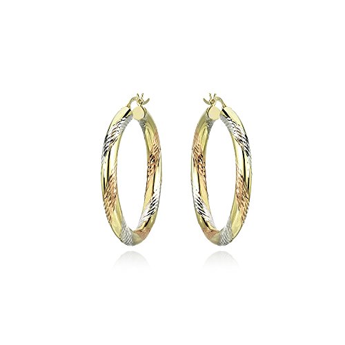 These earrings display a pair of tri-color diamond cut hollow tube hoops. They are lightweight, have a comfortable fit and are an ideal size for daily and evening wear. These medium hoop earrings are approximately 1 ½ inches in diameter. They are high quality fashion earrings, crafted of 14k yellow, white and rose gold and secure with click-top back findings.