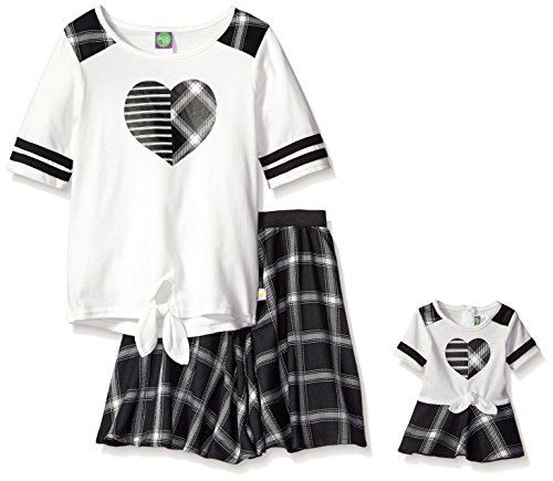 3/4 sleeve knit top with heart applique and tie front detail. Woven plaid skirt. Comes with matching doll garment.