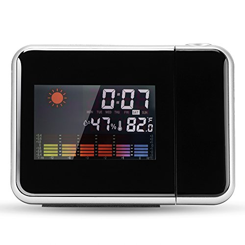 Specification: Type: Projection Forecast Alarm Clock Material: ABS Item Color: Black Projection Color: Multi-color Project Distance: 1-5m / 3.3-16.4ft Measure Temp. Range: -9.9~60°C / 14.2~140°F Measure Humidity Range: 20~90% Display / Function: Weather, calendar, time, °C/°F temp, humidity,12/24 hour forma, alarm, snooze Power Supply: 2*AAA alkaline battery (battery is not included) or DC 4.5V voltage through 3.5mm port (cable is not included)br>Size: 15*11*6cm / 5.9*4.3*2.4" (L*W*H) Net Weight: 0.18kg / 6.3oz