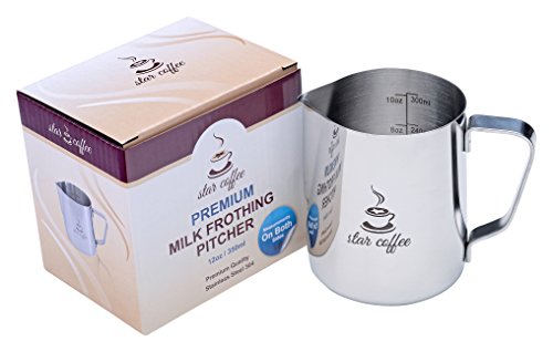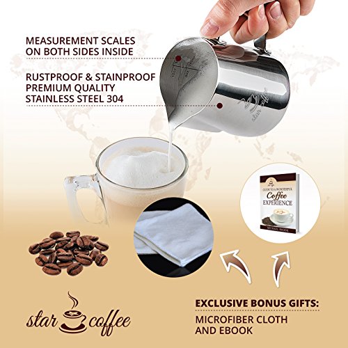 Star Coffee 12, 20 or 32oz Stainless Steel Milk Frothing Pitcher - Measurements on Both Sides Inside Plus eBook & Microfiber Cloth - Perfect for Espresso Machines, Milk Frothers, Latte Art