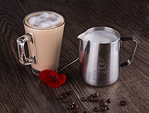 - EXCLUSIVE BONUS GIFTS: Get this top quality milk frothing pitcher with a completely free, bonus microfiber cloth for wiping any spills and a unique “Guide To A Wonderful Coffee Experience” eBook with life-saving tips and tricks for a perfect cup of coffee!