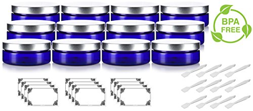 4 oz / 120 ml Cobalt Blue PET Plastic (BPA Free) Refillable Extra Low Profile Jar with Silver Metal Lid (12 PACK) + Spatulas and Labels