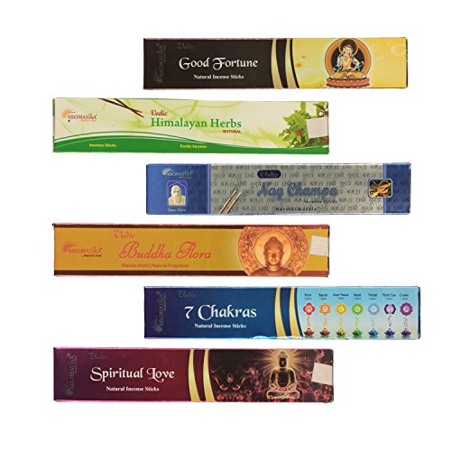 - Aromatika® 6 assorted masala incense sticks vedic Nag Champa , 7 Chakra , Buddha Flora , Himalayn Herbs , Good Fortune , Spiritual Love with metal sun incense stick holder.
