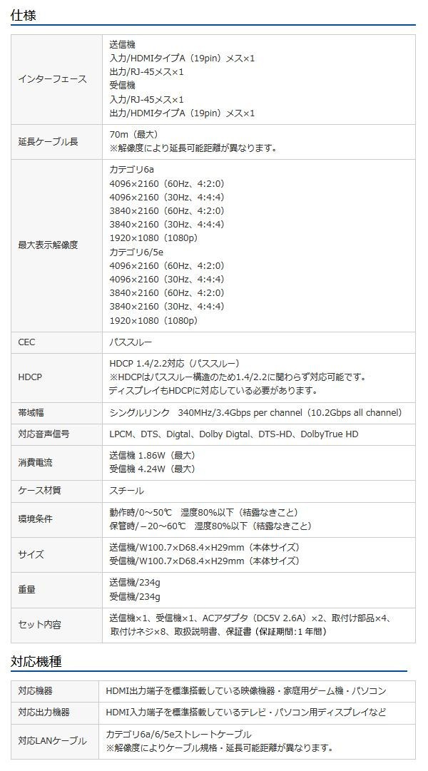 HDMI信号を4K解像度なら最大40mまで、1080p解像度なら最大70mまで延長することができるHDMIエクステンダーです。送信機と受信機のセットからなり、ユニット間をカテゴリ6a/6/5eストレートケーブル(別売)1本を使用して延長することができます。 |