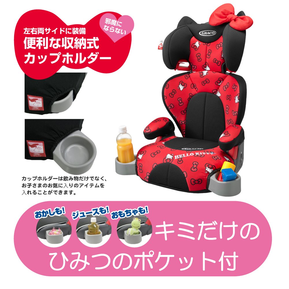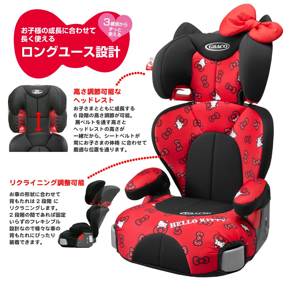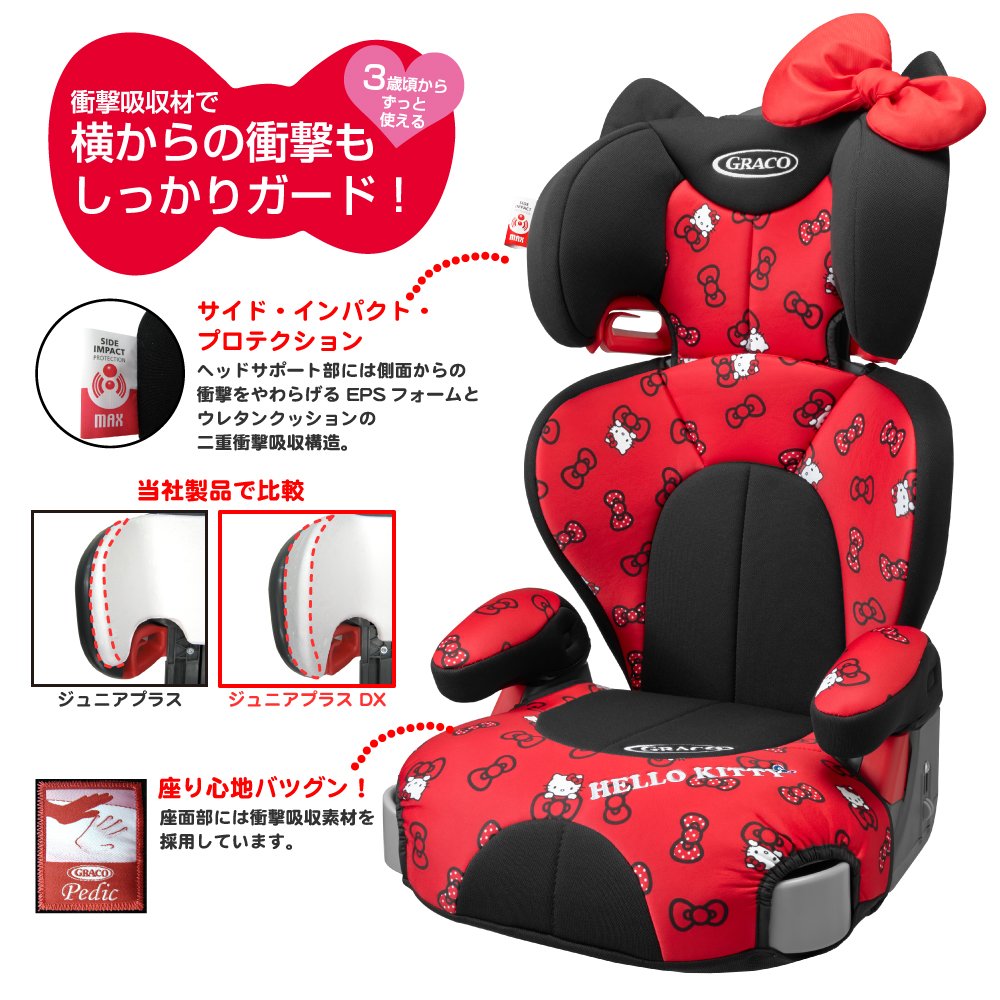 Hello Kitty is a member of the Junior Seat "Junior Plus DX" series which can be used from 3 years old firmly.