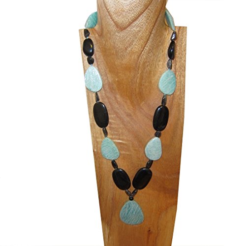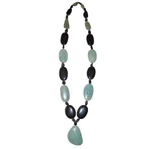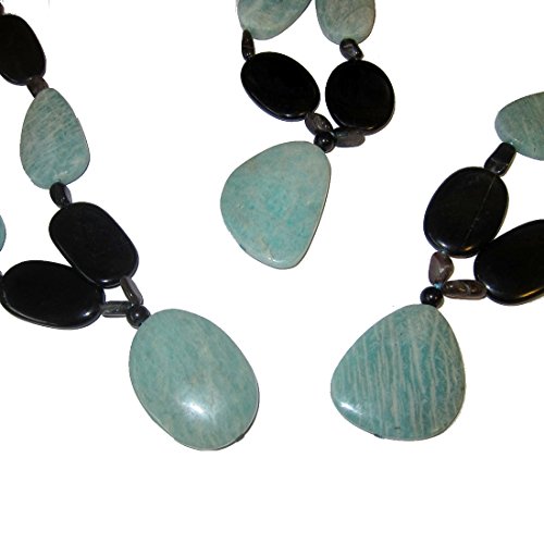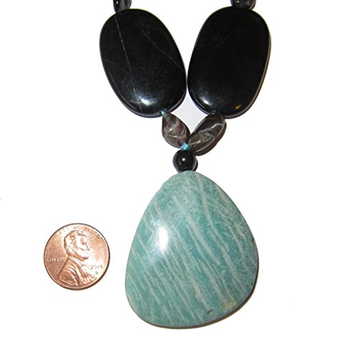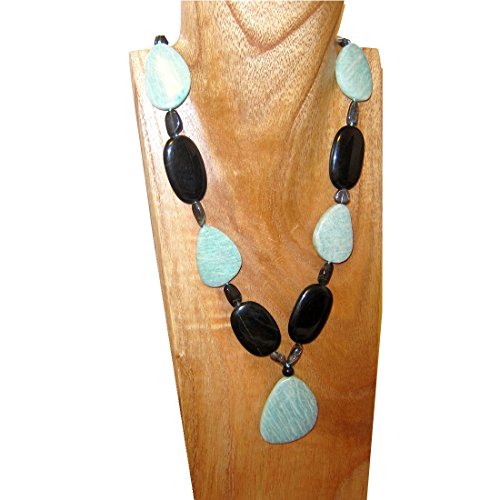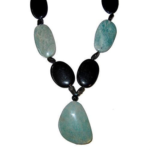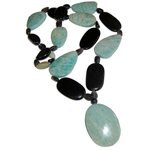 Goddess Gemstone Necklace Your deluxe healing necklace features an aqua green amazonite pendant on a gemstone strand. Big black onyx are intermixed to form a bold contrast on the eye catching piece, with accents of black moonstone and/or green aventurine. You receive one unique necklace per order from a limited edition of 3. Each is slightly different with varying beads and formations, as they are hand made to be one of a kind. The necklace makes a grandiose gift for yourself or someone special.