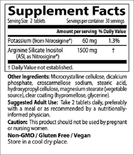 -. Feature : Fast Acting Arginine Complex with Nitrosigine uses a patented ingredient of bonded arginine silicate / Nitrosigine has been clinically shown to significantly boost nitric oxide (NO) levels, a key factor in increasing blood flow to working muscles / Significantly enhances blood proteins related to vasodilation and heart health / Takes effect in as quickly as 30 minutes and keeps delivering benefits up to 3 hours after a single dose / Non-GMO, Gluten Free, Vegan