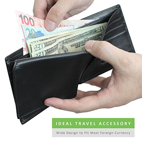 SPACIOUS TRAVEL ACCESSORY - Dual currency compartments large enough to fit foreign currency with six spacious card slots and two utility pockets, all layered with RFID blocking protection for peace of mind in crowded airports and terminals