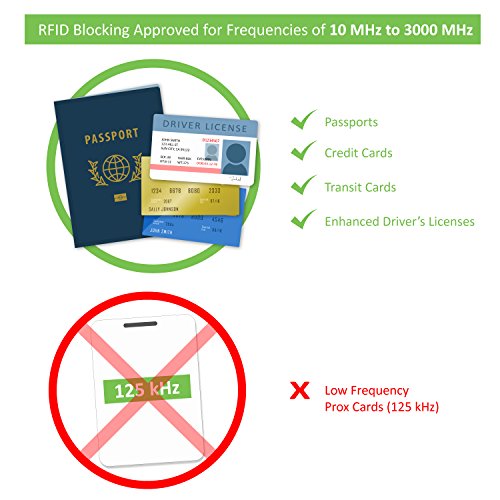 Please note: This wallet shields RFID frequencies ranging from 10MHz to 3000MHz. It does not shield against older proxy cards that operate at low frequencies of 125 kHz.