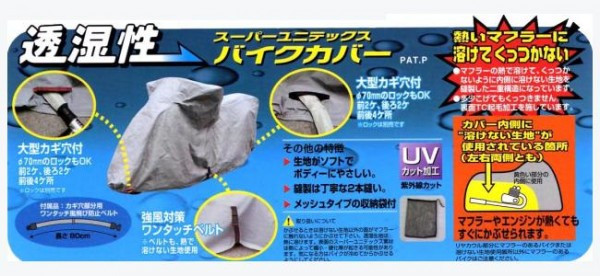 | 内部にこもった湿気を外に放出します。4層構造で雨や紫外線、ホコリなどをシャットアウトし、さらに内側に溶けない生地を使用しているので、走行後すぐのマフラーやエンジンが熱い時でもすぐにかぶせられます!! |