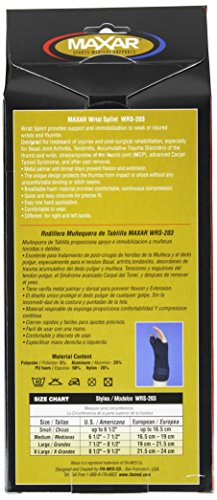 MAXAR Wrist Splint provides support and immobilization to weak or injured wrists and thumbs. It designed for treatment of injuries and post-surgical rehabilitation, especially for Basal joint Arthritis, Tendinitis. Accumulative Trauma Disorders of the thumb and wrist, strains/sprains of the thumb joint (MCP), advanced Carpal Tunnel Syndrome, and after cast removal. The unique design protects the thumb from impact or shock without any uncomfortable binding or stitch seams. Conditions: Sprains, strains, wrist injuries, injuries, surgery, sports injuries, wrist pressure, arthritic conditions, carpal tunnel syndrome, weak wrists, aching wrists, cast removal, tendinitis, wrist immobilization, basal joint arthritis, thumb immobilizationFeature