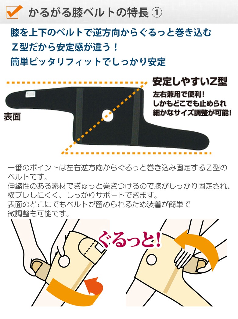 ●膝を上下のベルトで逆方向からぐるっと巻き込むZ型だから安定感が違う!簡単ピッタリフィットでしっかり安定