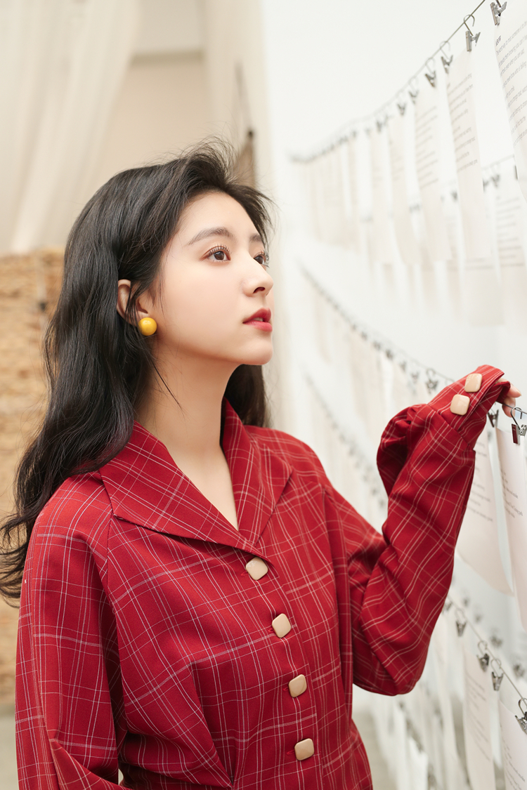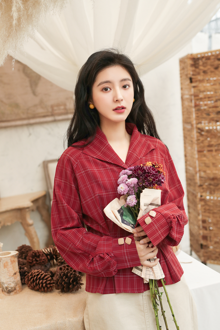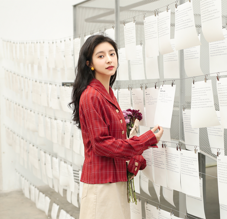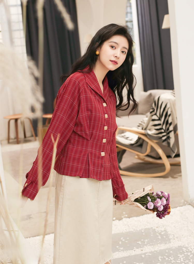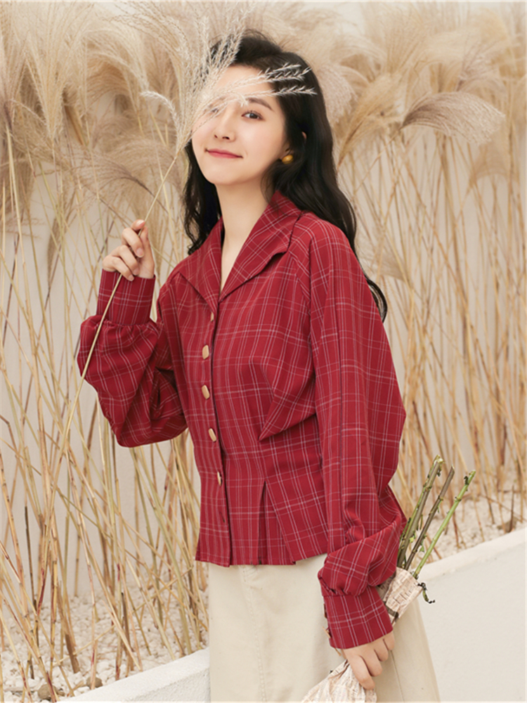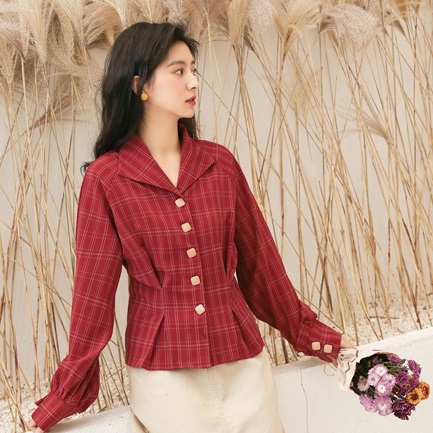 深みのあるレッドカラーとチェック柄でレトロガーリーな雰囲気に仕上げたブラウスです♪