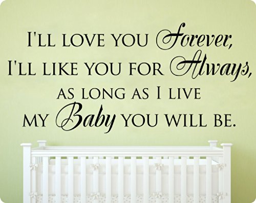 -. Binding : Tools & Home Improvement -. Brand : WallPressions -. Color : Black -. EAN : 0700465018458 -. Feature : Size: 24" x 48 / Color: Matte Black / High-Quality Die-Cut Oracal Vinyl Made In the USA / Written & Video Instructions Included / Will not damage walls Non-transferrable -. Label : Wall Pressions -. Manufacturer : Wall Pressions -. ProductGroup : Home Improvement -. ProductTypeName : BUILDING_MATERIAL -. Publisher : Wall Pressions -. Studio : Wall Pressions -. Title : 48" I Love You Forever, I like You For Always As Long As I Live My Baby You'll Be Nursery Infant Wall Decal Sticker Art Mural Home Décor Keepsake Quote -. UPC : 700465018458