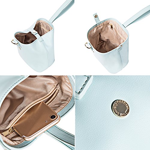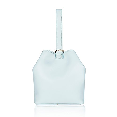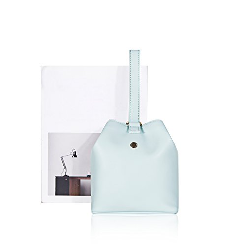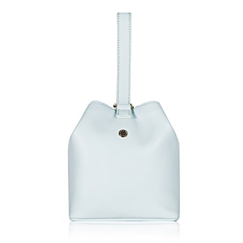 Wristlet pouch with wrlstlet on top centered and D-ring lock. Folded-in top gussets with metal snap closure. Inside zipped pocket. Front logo stud
