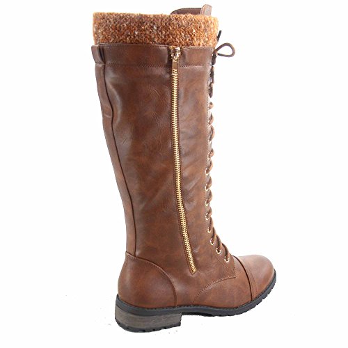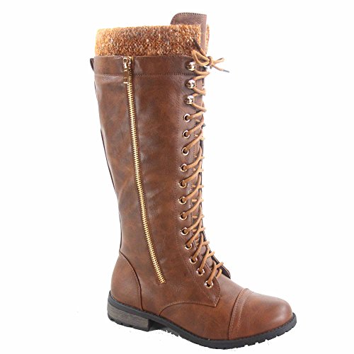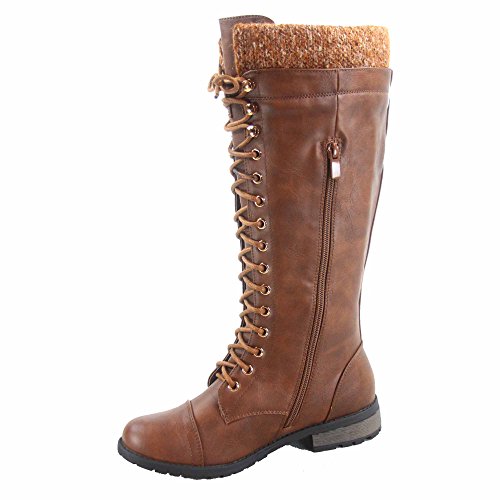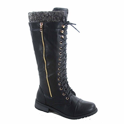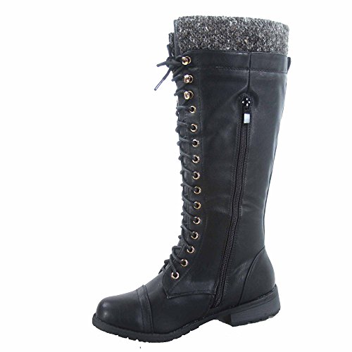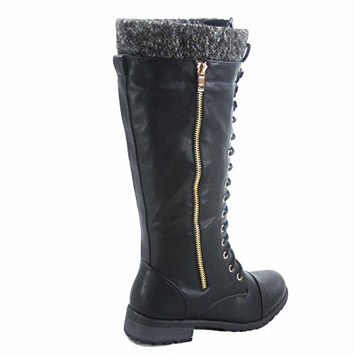 Forever Link Mango-91 Women's Fashion Round Toe Low Heel Mid Calf Knit Trim Combat Boots Shoes