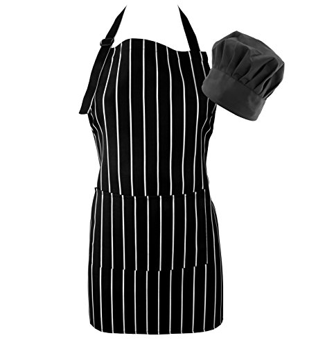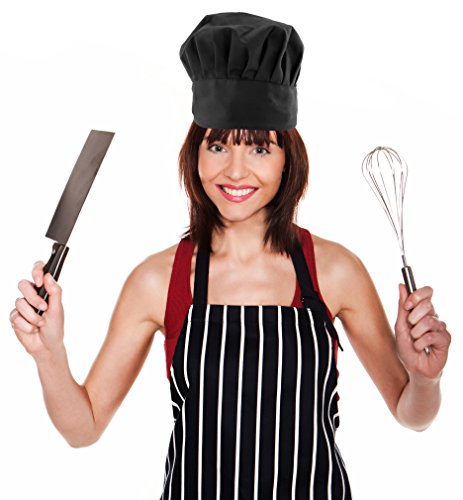✓ CHEF IN THE KITCHEN! - Be professional from preparation to plating with our set of chef accessories! Each set includes a black and white pinstripe apron and matching solid black chef hat. Great for chefs and serving staff both.
