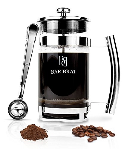 -. Feature : FILLS 4 - 8 CUPS OF DELICIOUS COFFEE - Each French Press can make 8 cups of coffee or 4 mugs of coffee. Know that with confidence, your coffee with taste delicious as you press your way to the perfect brew of coffee. / BEAUTIFULLY ELEGANT GIFT PACKAGING MAKE THIS THE PERFECT HOLIDAY GIFT - View our images... Our packaging is elegant and makes this french press coffee maker set the perfect holiday gift and christmas gift for anyone. / STAINLESS STEEL DOUBLE BOROSILICATE HEAT RESISTANT GLASS - Elegantly designed and made of double borosilicate glass, you can feel confident the glass is very durable and won't break when hot water is poured inside the french press. / MULTIPLE USES AS A COFFEE & TEA PRESS - The french press can even be used for tea in addition to coffee. Simply place the tea similarly as you could the coffee, allow it to steep for 2 - 3 minutes, press down and you'll have a perfect cup of tea as well. / 100% LIFETIME MONEY BACK GUARANTEE - If you are not satisfied with the french press coffee maker, we will refund you your money, no questions asked. We have that much confidence in the beauty, design, and functionality of the Bar Brat French Press Coffee Maker.