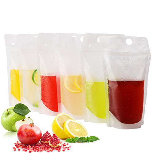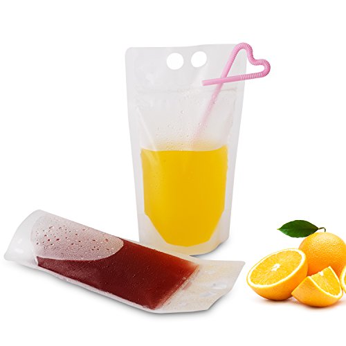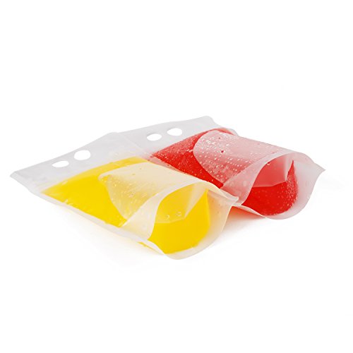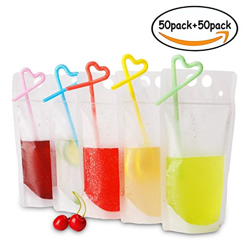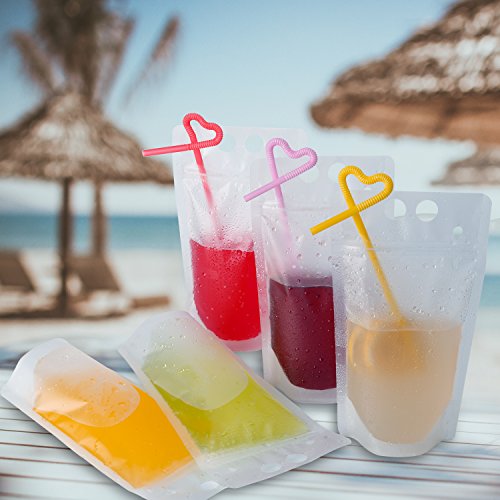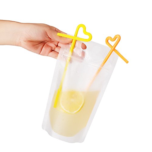 50-Pack Heavy Duty Hand-held Translucent frosted Reclosable Zipper Stand-up Heat-proof Plastic Drink Pouches Bags with 50-Pack Colorful Disposable Drinking Straws