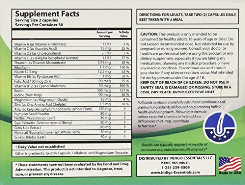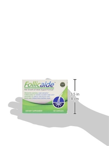 -. Binding : Health and Beauty -. Brand : Follicaide -. Color : natural -. EAN : 0713179921556 -. Feature : • Follicaide is a Hair Support Solution for both MEN & WOMEN / • Scientifically formulated combination targets and defends againt DHT, a suspected leading cause of hair loss / • Designed to Promote Follicle Health, Hair Strength and Hair Volume / • Contains Natural Essential Vitamins, Minerals and Nutrients to support and maintain a healthy foundation for hair nourishment, strength, and healthier regrowth / • Manufactured in a FDA and GMP Certified Facility -. Label : Indigo Essentials -. LegalDisclaimer : These statements have not been evaluated by the Food and Drug Administration. This product is not intended to diagnose, treat, cure or prevent any diseases. -. Manufacturer : Indigo Essentials -. PackageQuantity : 1 -. ProductGroup : Health and Beauty -. ProductTypeName : HEALTH_PERSONAL_CARE -. Publisher : Indigo Essentials -. Size : 60ct 1-Month Supply -. Studio : Indigo Essentials -. Title : Follicaide - Hair Growth Follicle Support & Thinning Resistence - 60 Count - 1 Month Supply -. UPC : 713179921556