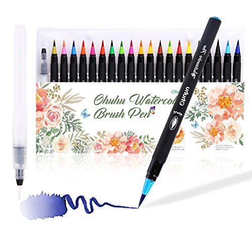 Watercolor Brush Markers Pen, Ohuhu 20 Colors Water Based Drawing Marker Brushes W/ A Water Coloring Brush, Water Colored Ink W/ Soft Flexible Tip for Adult Coloring Books, Manga, Comic, Calligraphy
