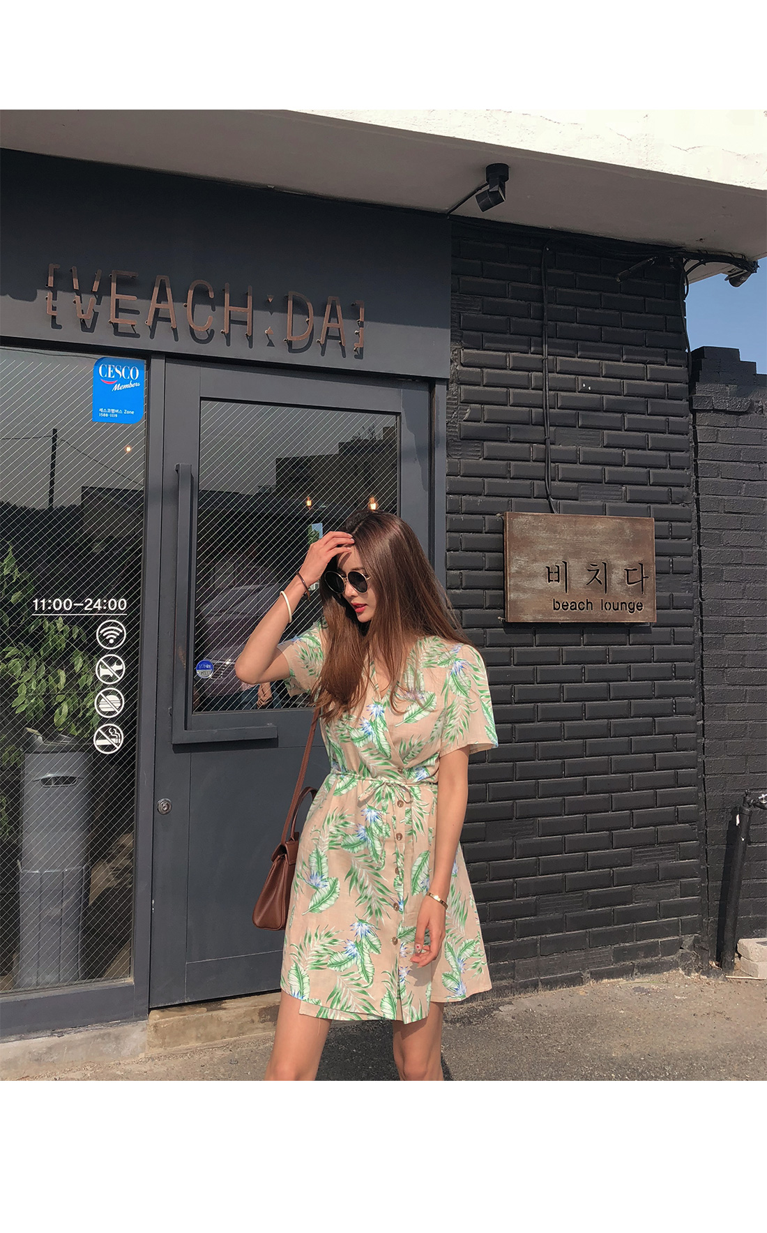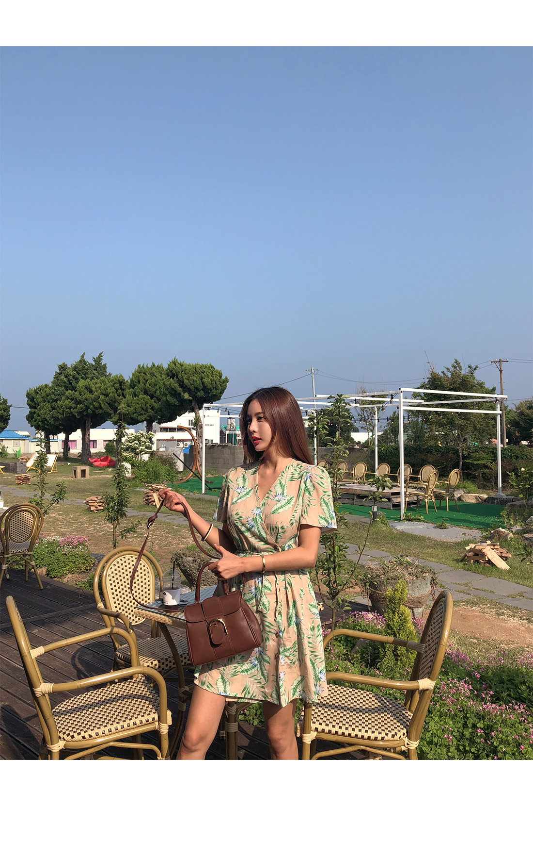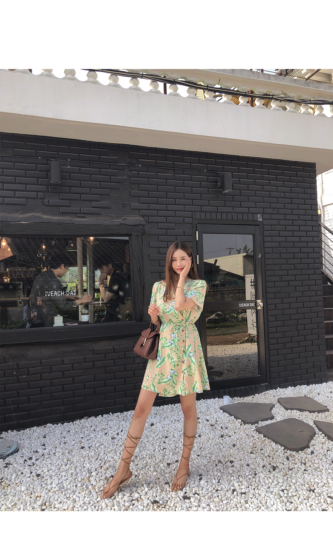 전체적으로 화사한 나뭇입 패턴이 룩에 포인트를 더해주며