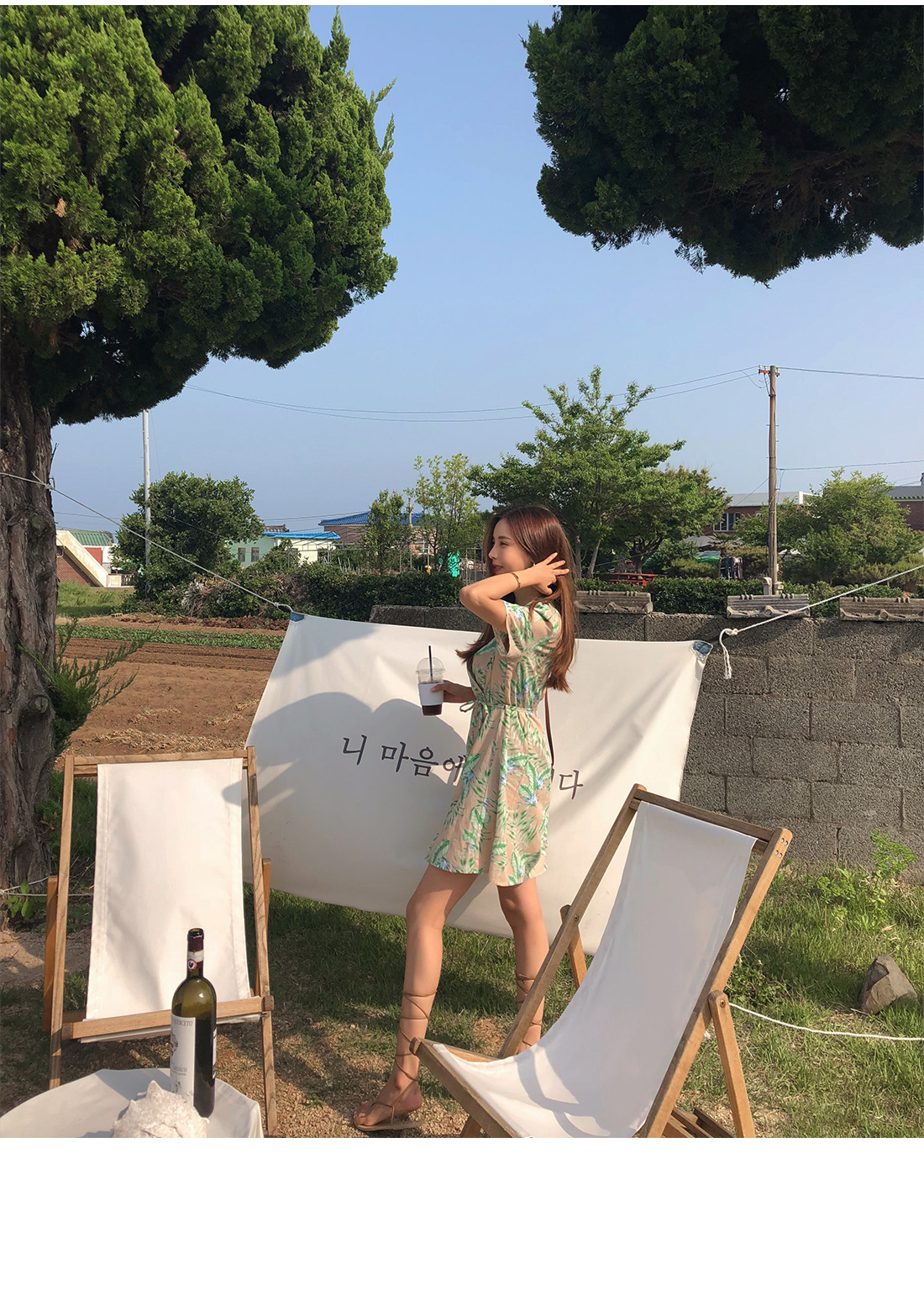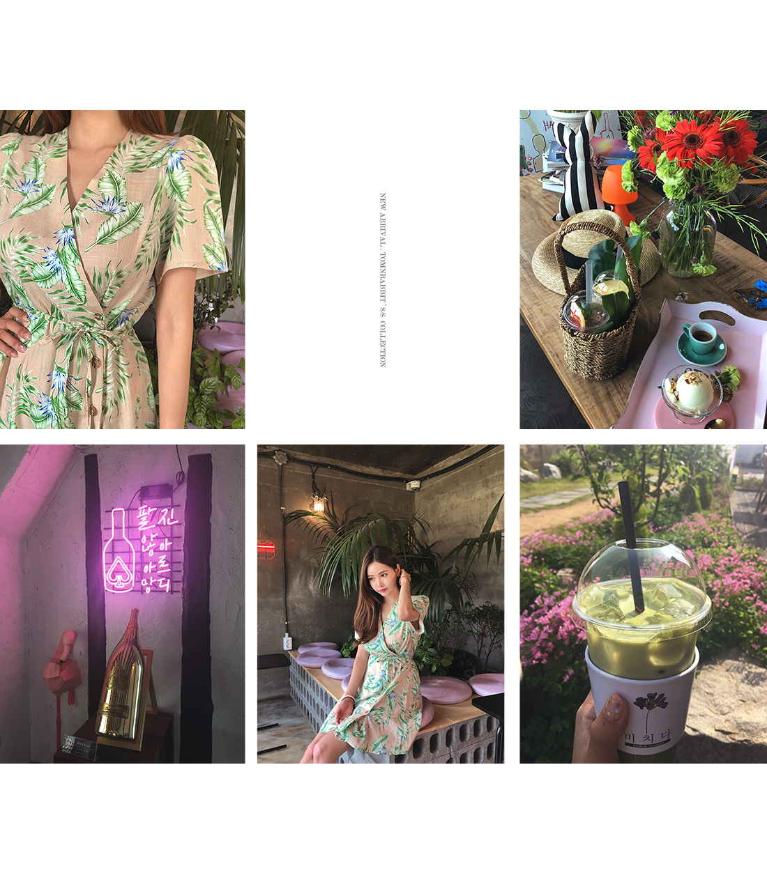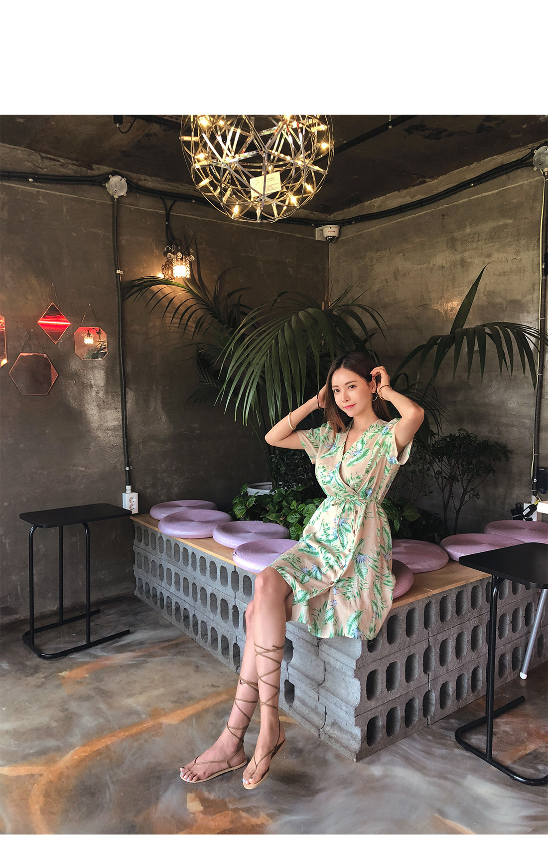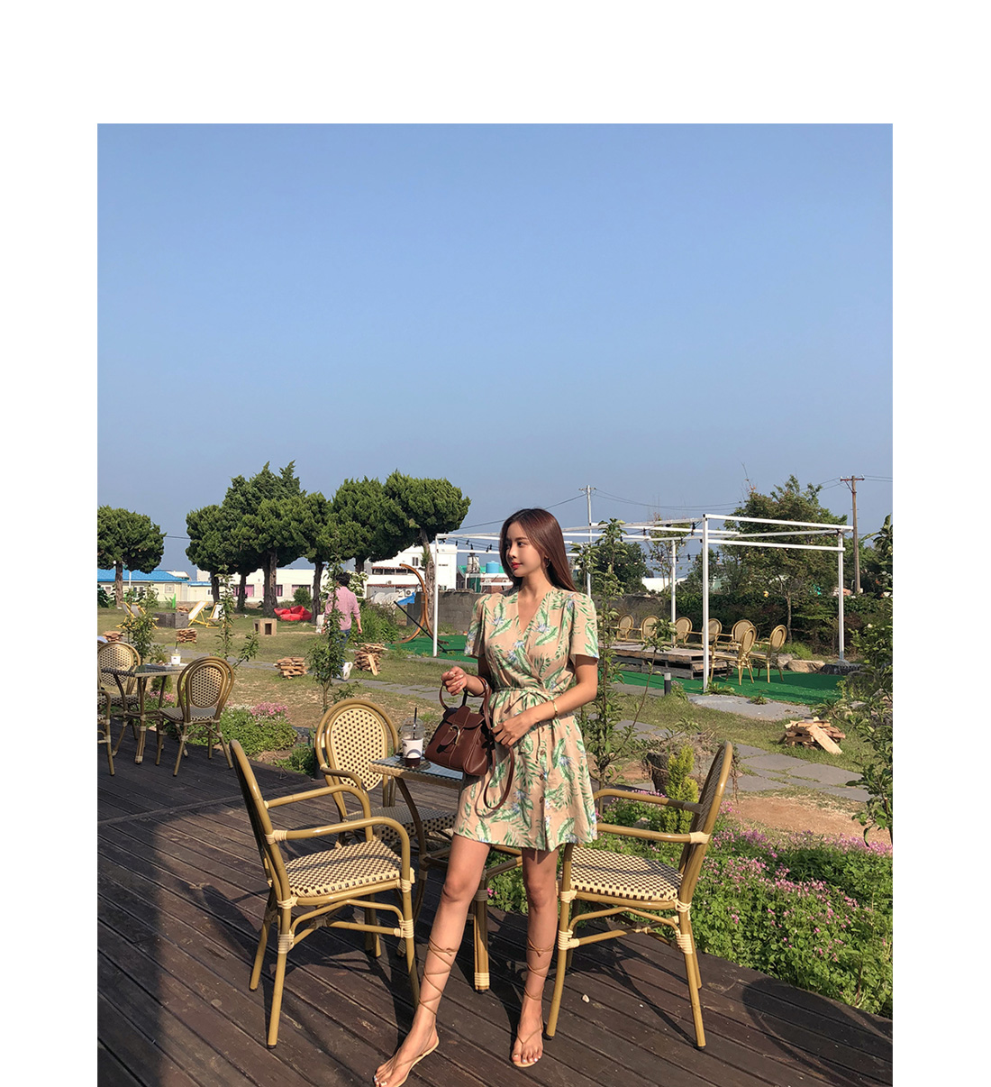전체적으로 화사한 나뭇입 패턴이 룩에 포인트를 더해주며