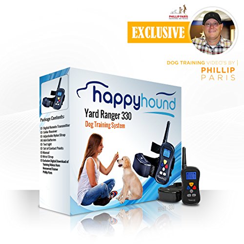 Studio : Happy Hound Publisher : Happy Hound Binding : Misc. Product Description The Happy Hound Yard Ranger 330 Dog Training System is the perfect solution to providing the training that your dog needs. Suitable for dogs 20 lbs. and up, the water-resistant Happy Hound Yard Ranger 330 features a compact, ergonomic design that's effective, simple and easy to use. You won't need to worry about restrictive boundaries. The Happy Hound Yard Ranger 330 features a range of up to 330 yards or the distance of 3 football fields! Featuring several different training modes, you can select from up to 16 stimulation, tone and humane vibration levels to give your dog the most effective and positive training experience. All of these features ensure that you can select a training mode that's perfect for your dog's needs. PRODUCT FEATURES: ? Receiver collar size fits dogs weighing 20 lbs. and up ? Suits a wide range of dog training applications and purposes: Basic Dog Obedience, Counter Surfing, Trash Diving, Digging, Jumping, and much more ? 16 stimulation and vibration training levels to suit every dog's training needs ? Water Resistant ? Range: Up to 330 Yards ? Vibration, Stimulation and Tone Training Modes ? Simple, user-friendly controls ? Ergonomic design for maximum comfort ? Large, backlit LED screen for the best visibility on bright, sunny days WHAT'S IN THE BOX: ? Digital Remote Transmitter ? Collar Receiver ? Test Light ? Set of Contact Points ? Wrist Strap ? Batteries ? Manual ? Exclusive digital download of training videos from renowned trainer Phillip Paris 0
