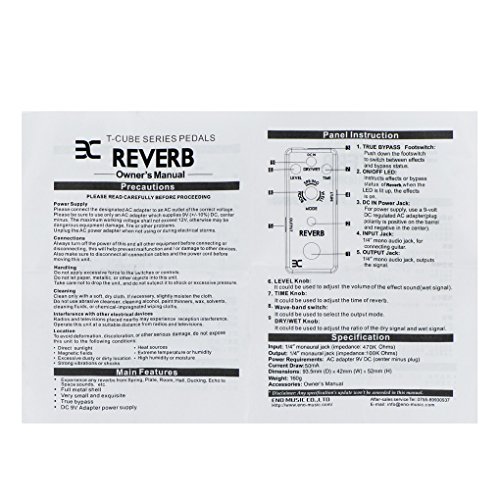 Studio : EX-AMP Publisher : EX-AMP Product Description Feature:* Experience any reverbs from Spring, Plate, Room, Hall, Ducking, Echo to Space sounds, etc.* With 4 functional knobs; Level knob, Time knob, Wave-band switch, Dry/wet knob; to adjust the performence of the effect sound* LED indicator instructs effects or bypass status of Reverb effect, when the led is lit up, the effects is on.* Small and exquisite design with full metal shell.* True bypass style, with durable jacks and foot switch.* Can be used Negative DC 9V as Power Supply.Specification:Reverb Effect PedalInput: 1/4" mono jack (impedance 470k Ohms)/br>Output: 1/4" mono jack(impedance 100k Ohms)Power Requirements: AC adapter 9V DC (center minus plug)Current Draw: 50 mADimensions: 93.5mm x 42mm x 52mmAccessories: Owner's ManualPlease Read Manual Before Operating.Package Includes:1 x Reverb Effect Pedal1 x Manual1 x Bag1 x Patch Cable 0